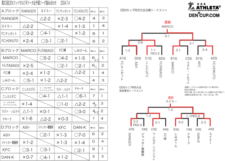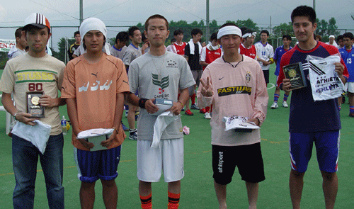夏日と思わせる晴天の中、今回も楽しく開催できました。 優勝は前回敗者復活優勝したMARCOさんが決勝トーナメントでの優勝となりました。 おめでとうございます。 予選リーグでは引き分けや1点差ゲームも多く、トーナメントでもPK戦や1点差ゲームが多かったことからも今回は実力伯仲の中、どのチームが優勝したもおかしくなかったと思います。 主催者、今回は裏方に徹しましたが、、、、我慢できません、、、、。 すいません。 やはり次回からはボール蹴らさせていただきます。 それではまた、秋にみなさんお待ちしています。 一緒に楽しみましょう。 主催者 田畑雅宏 ![]() 名前、、強いです。 ![]() アンブロ模様にして下さい。 |